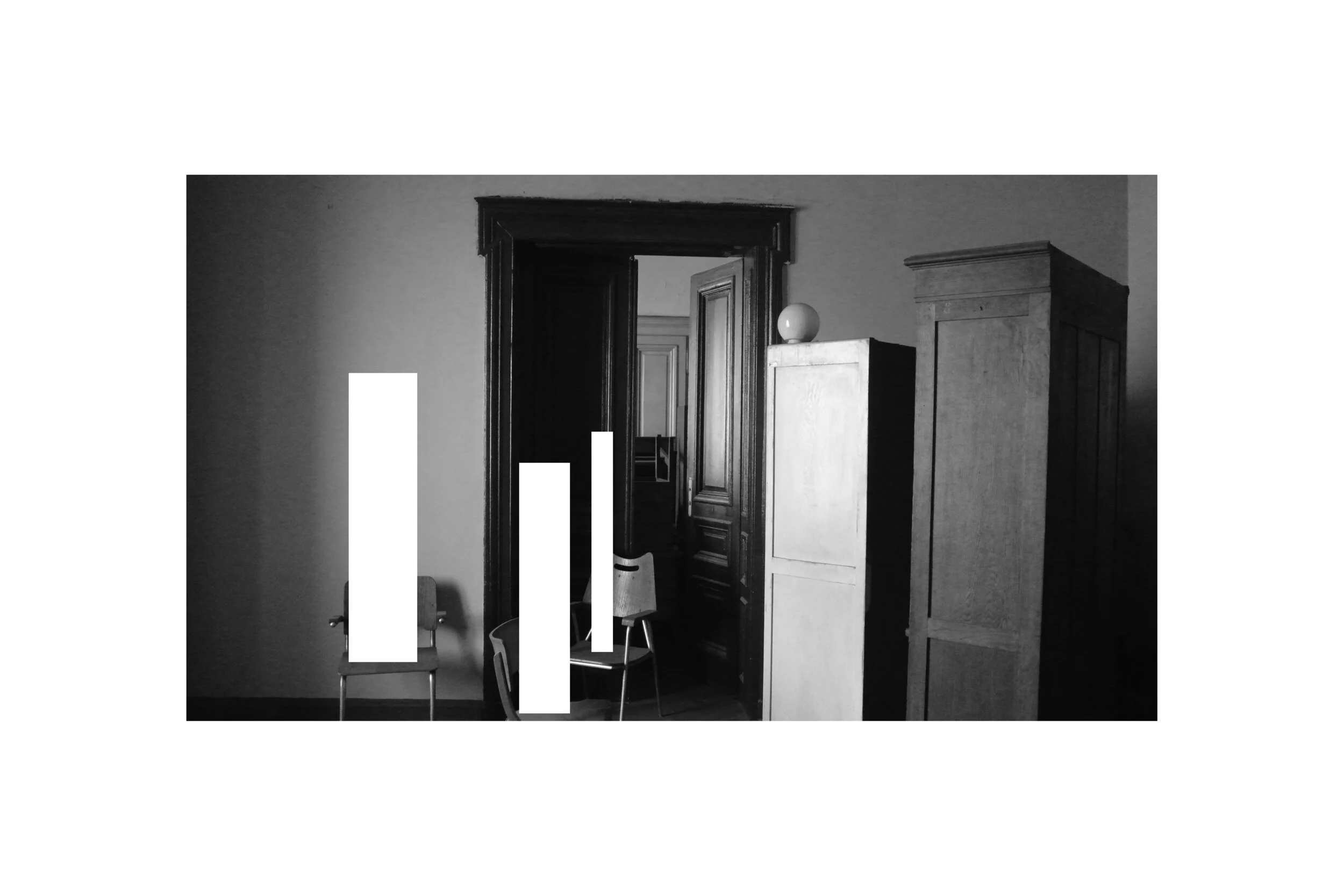 In Transition series of photographs is a site-specific work within the October Salon (Good Life, 2012) curated by Branko Dimitrijevic and Mika Hannuka. The photographs' interior spaces show various rooms of the former Geodetic Institute building before its restoration for the exhibition purpose. The depicted scenes show traces of many different past uses: a bank, an office, an Italian movie set, often in the same image. Additionally, the artist collages a group of white geometric "blocks" in the photographs. For the installation, a set of vitrines found on the site are modified and used as display units. The artist makes arrangements that look like scenes in anticipation of an event that is yet to happen. Bizumic's approach presents the viewer with the act of looking itself, emphasising observation as a labyrinthian, continuous process.